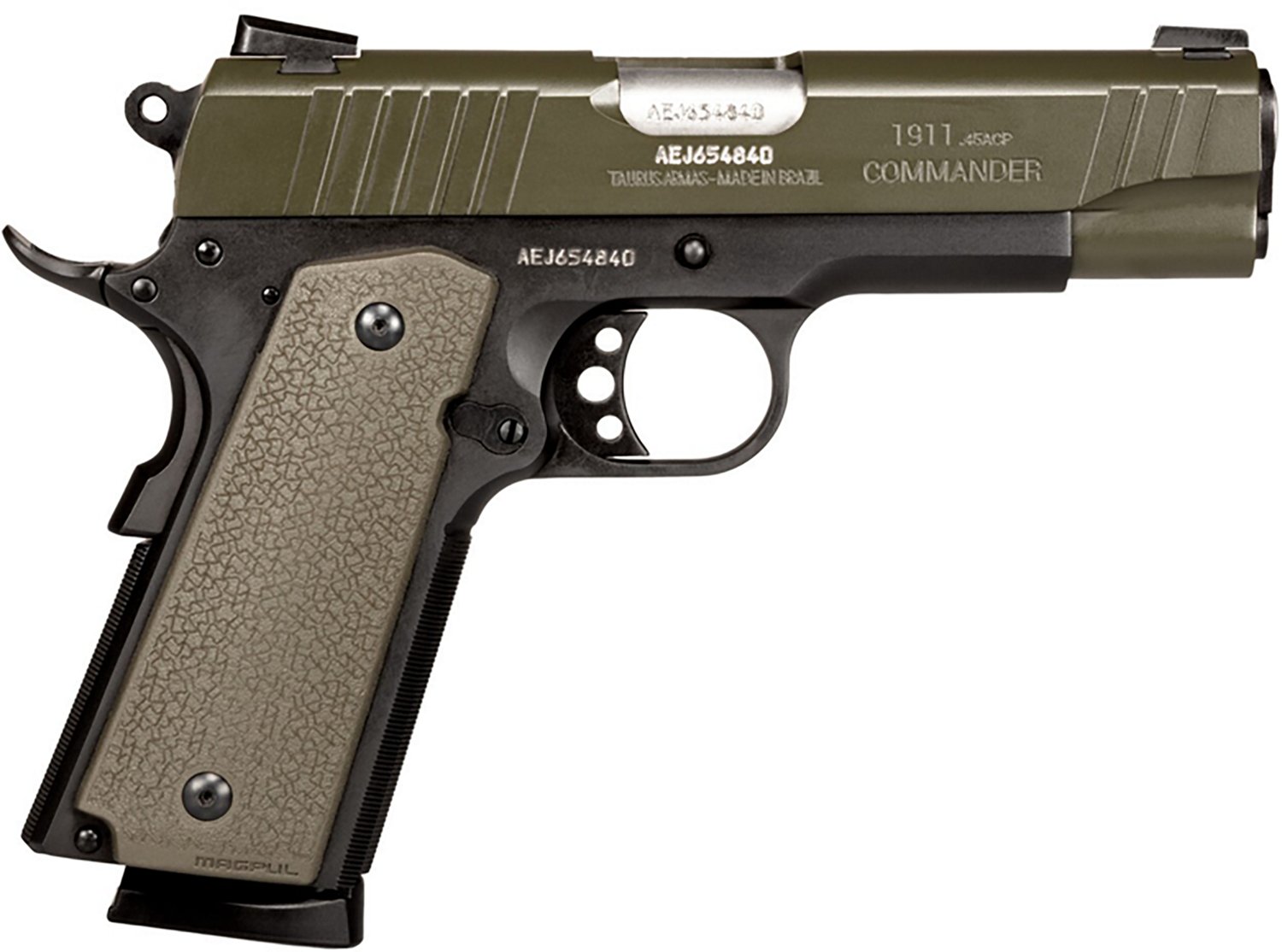 The Taurus 1911 Commander .45 ACP Pistol has a 4.2-inch barrel, a matte finish and an 8-round capacity. This single-action pistol has a manual grip safety, a checkered poly OD grip and front and rear Novak drift adjustable sights.