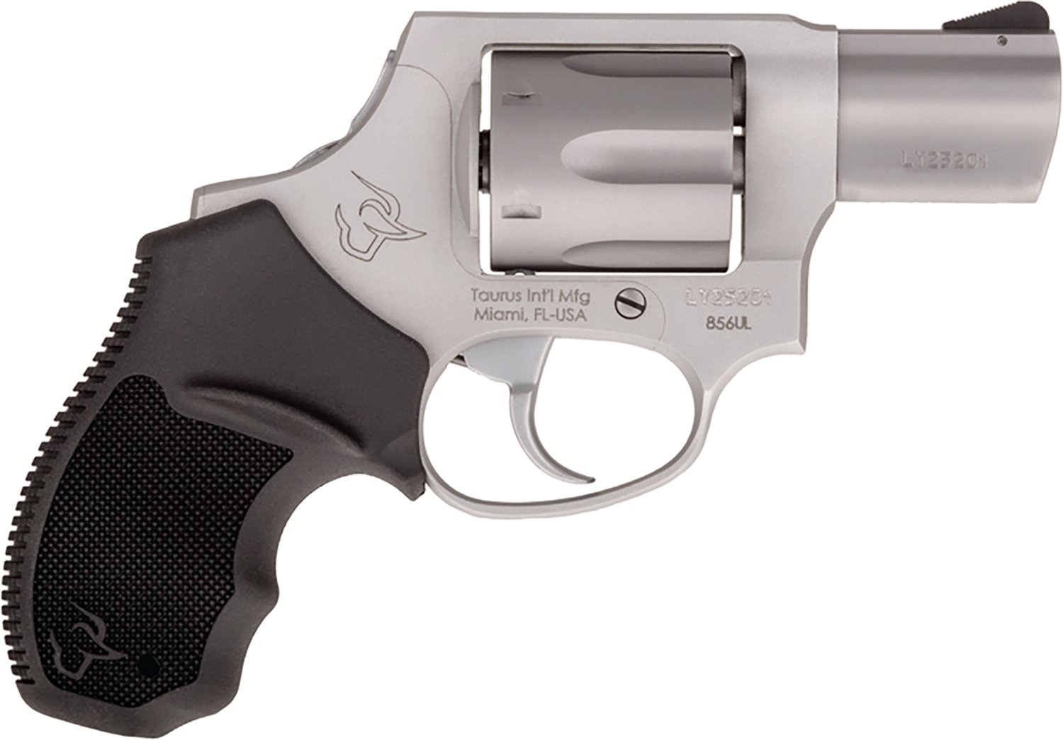 The Taurus 856 Ultra Lite .38 Special +P Revolver is double action and has a 6-round capacity. It's built with a stainless-steel cylinder and frame, and it features a finger grooved rubber grip. Ramp front and fixed rear sights and a transfer bar safety complete the design.