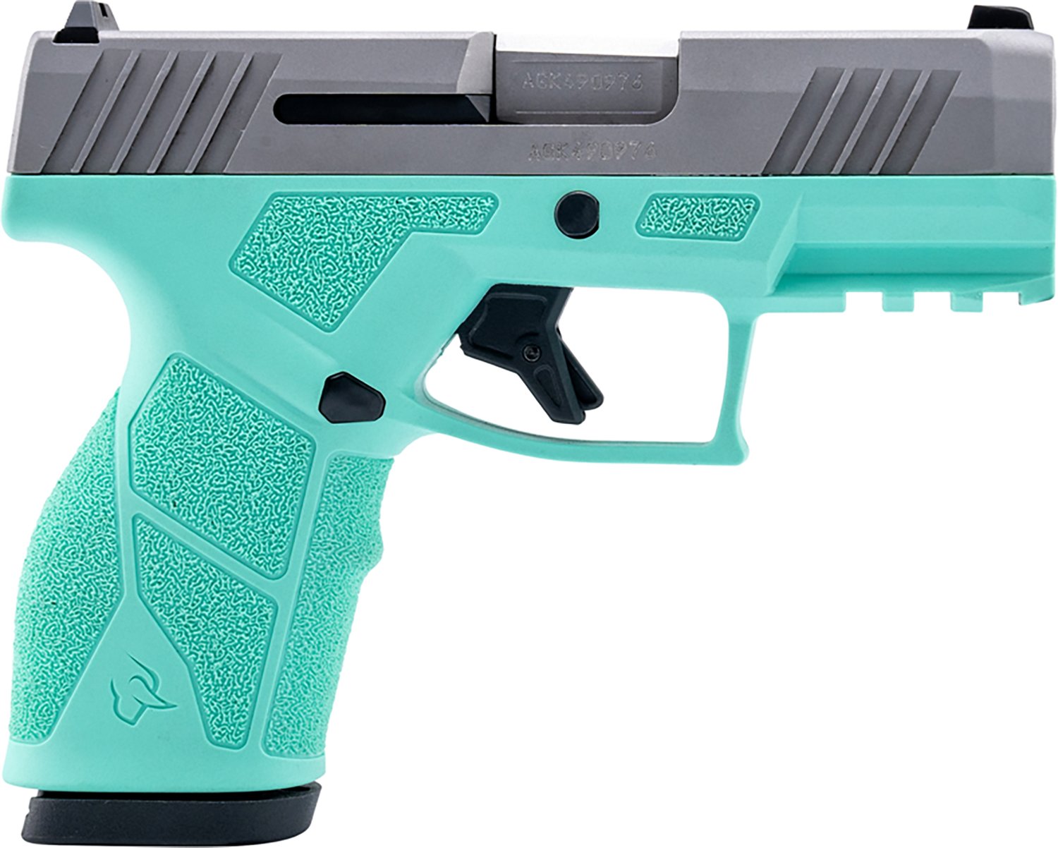 Head to the range with the Taurus GX2 9mm Semi-automatic Pistol. The steel frame has a stainless-steel finish, and the polymer grips have a cyan finish.