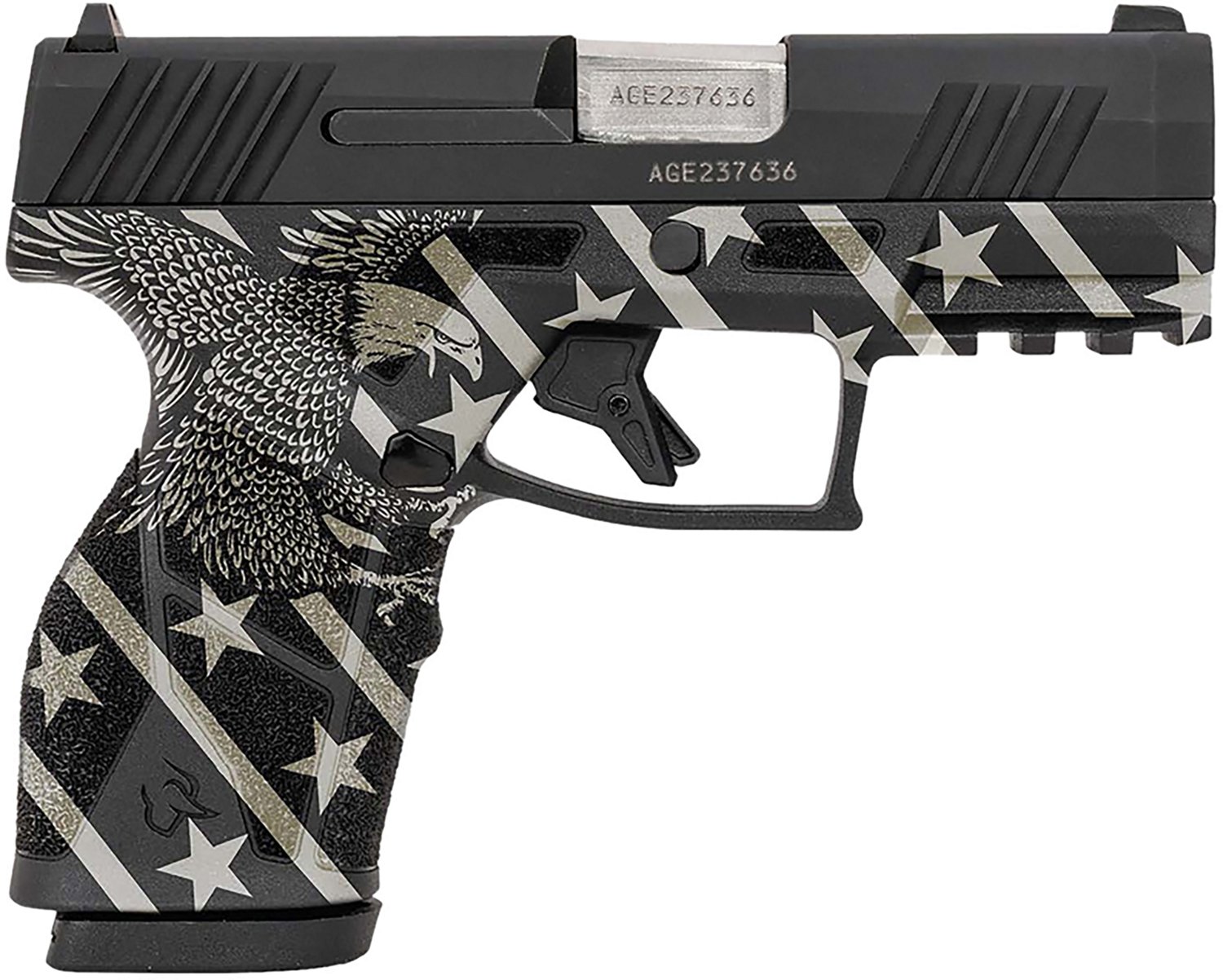 Arm yourself with the Taurus GX2 9mm Semiautomatic Pistol. It is semiautomatic with a 13-round magazine. The barrel with a black finish is 3.38-inches long, and it is equipped with a manual safety. The eagle frame engraving finishes off the design.