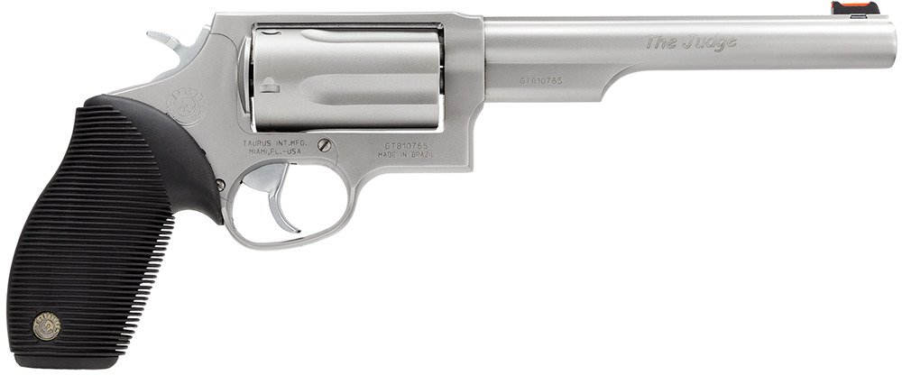 Chambered for both 2.5-inch .410 shells and .45 Colt ammunition, the Taurus Judge .45 LC/.410 Bore Revolver provides versatility. The compact frame is made from stainless steel and paired with a Ribber grip and an exposed hammer. It also boasts the Taurus Security System (TSS) and a transfer bar safety. Extended ejector rod.