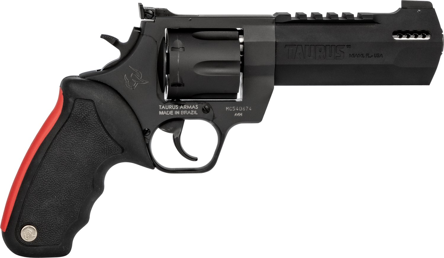 The Taurus Raging Hunter .44 Remington Magnum Revolver is single/double action and has a 6-round capacity. It's built with a ported barrel with picatinny rail, steel frame and thumb safety. Fixed front and adjustable rear sights and a black rubber grip with integrated red cushion insert complete the design.