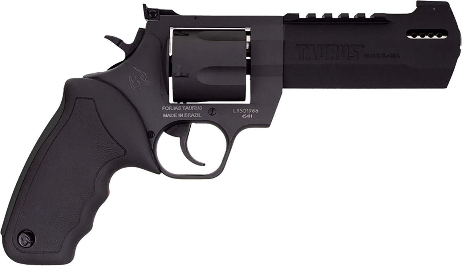 The Taurus Raging Hunter .454 Casull Revolver is single/double action and has a 5-round capacity. It's built with a ported stainless-steel barrel, a dual lockup alloy steel cylinder and an alloy steel frame with scope mount and Picatinny rail. Fixed front and adjustable rear sights, transfer bar safety and a gas expansion chamber complete the design.