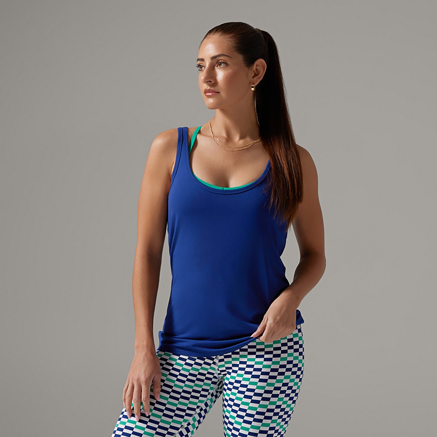 Look your best in the Tavi Women's Fitted Swoop Tank Top. It is made of 93% rayon and 7% spandex. The moisture wicking technology keeps you dry, and its open, scoop neckline shows off more skin. The longer length creates a body-hugging silhouette.