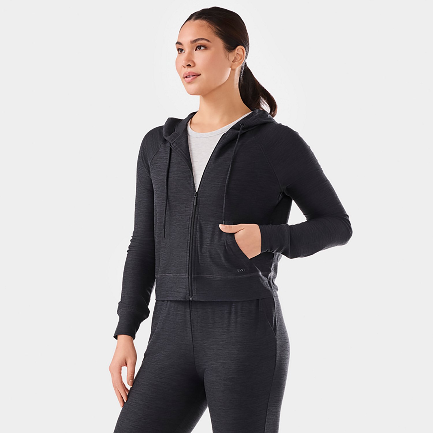 Stay comfy indoors and outdoors in this Tavi Women's SoftTec Zip Hoodie. It features moisture-wicking and quick-drying material to help you stay dry, and the hoodie is made of 45% recycled polyester, 44% polyester and 11% spandex for durability and a flexible fit.