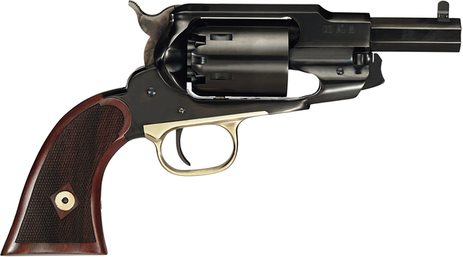 Head to the range with a classic Taylor's & Company 1858 The Ace .44 Caliber Single Action Walnut Revolver. It’s designed with a durable steel frame and snub nose barrel, and the.2-piece checkered walnut grip grants a stable hold.