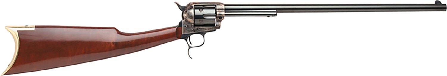 Head into the field with the Taylor's & Company 1873 Cattleman Revolving Rifle .44-40 Single-action Rifle. The 18-inch barrel has a blued finish, and the wooden stock has a walnut finish.