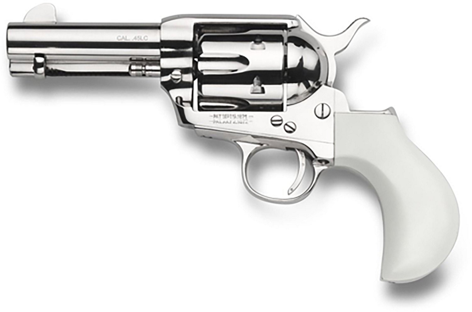 Hit your target with the Taylor's & Company 1873 TC9 Snubnose 9mm Single Action Flattop Birdshead Revolver. It’s designed with a nickel-plated finish for ample durability, and the.1-piece polymer ivory grip gives you comfortable control.