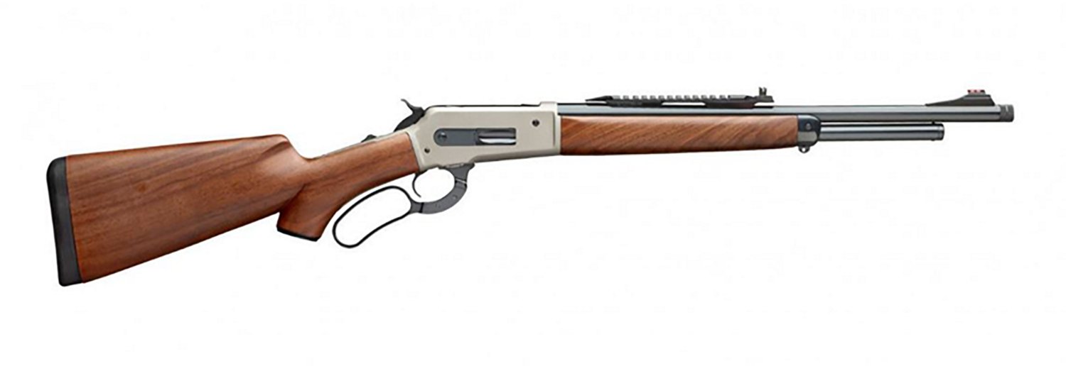 Head into the field with the Taylor's & Company 1886/71 Boarbuster Evolution 45-70 Govt Lever-action Rifle. The 19-inch barrel has a tan Cerakote finish, and the wooden stock has a walnut finish.