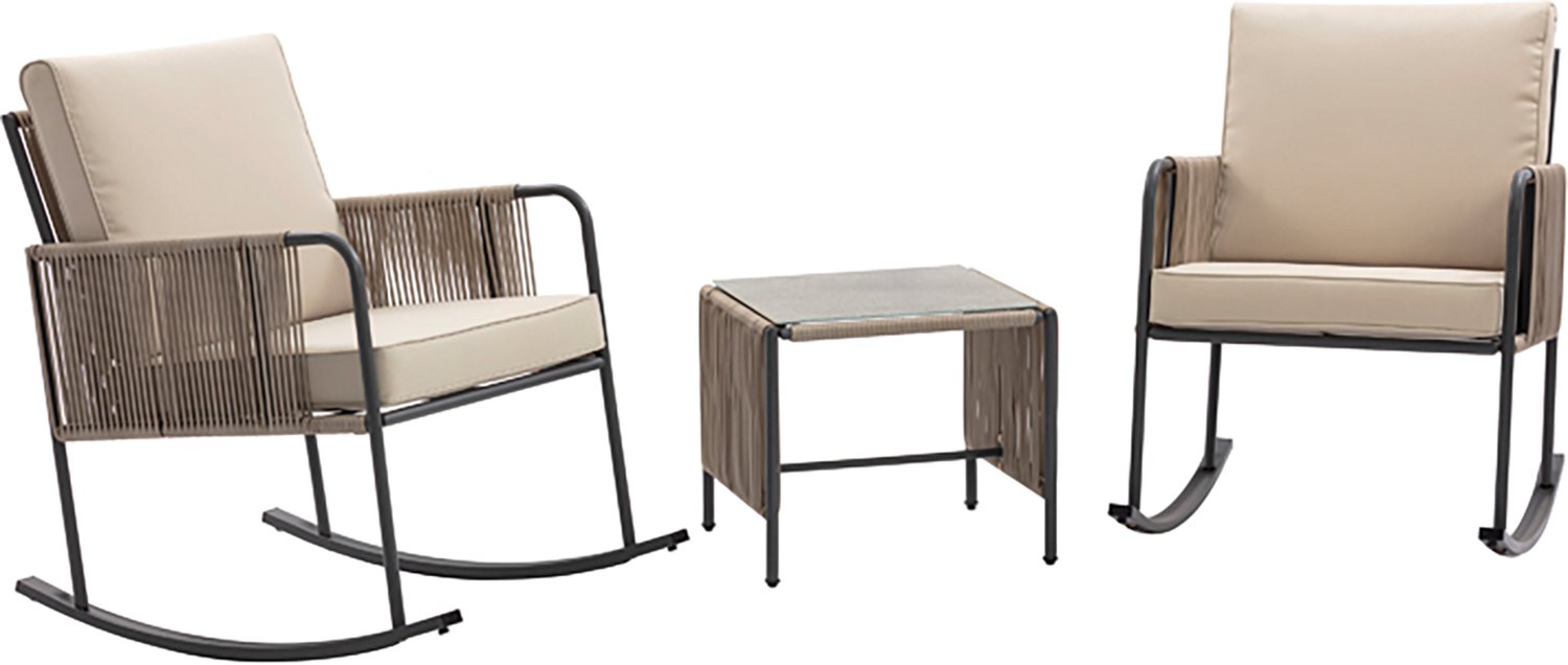 Sit back and relax with the Teamson Home Steel Frame Rocking Chair Conversation 3-piece Set. It is built with a rust-resistant powder-coated steel frame. The handwoven polyethylene rope accents offer a stylish, textural touch, and its ergonomic rocking design creates a soothing motion. The tempered 5mm glass with a stone-textured finish provides a durable surface that’s easy to clean.