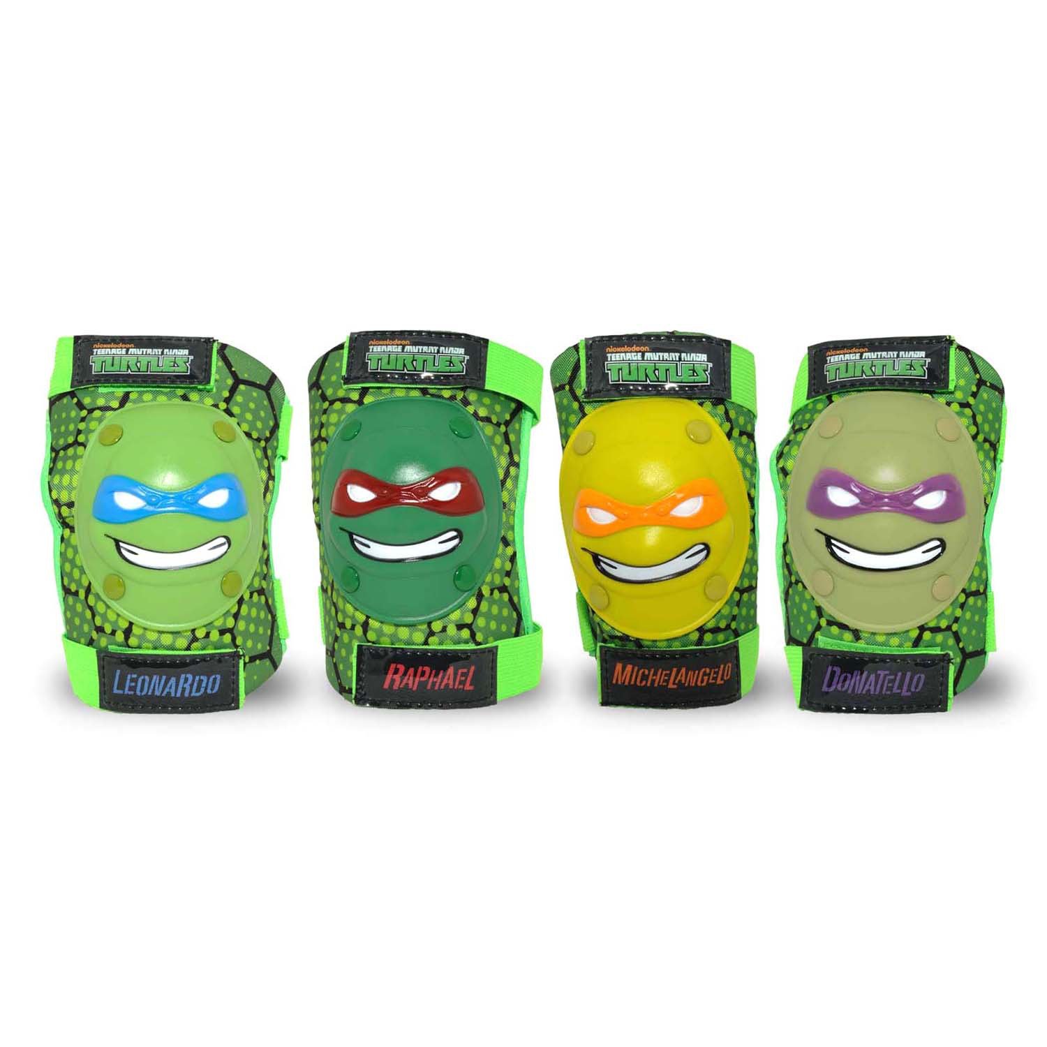 Your little one can shell shock his or her friends in the Teenage Mutant Ninja Turtles Kids' 3-D Elbow and Knee Pad Set, which includes 4 plastic knee and elbow pads that feature the molded, 3-D likenesses of Raphael, Donatello, Michelangelo and Leonardo for a fun look. The adjustable straps provide a comfortable fit.