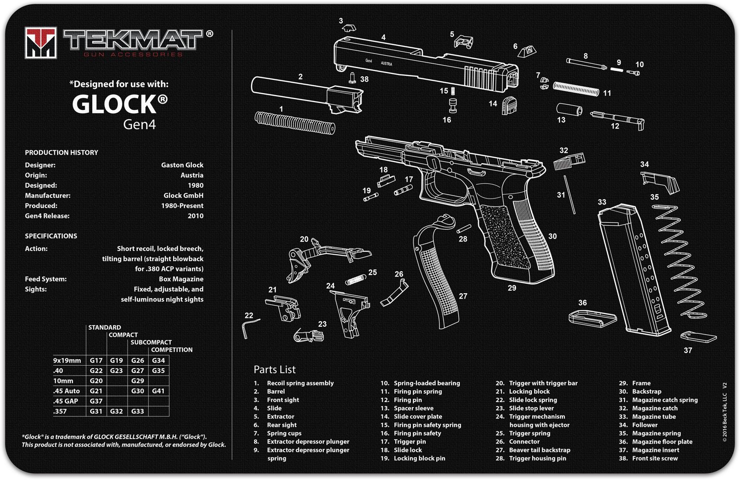 Keep the quality of your firearms up to your standards with the help of the TekMat GLOCK Gen 4 Gun Cleaning Mat. This printed gun cleaning and maintenance mat boasts an oil- and water-resistant surface with an ultrasoft feel to help protect your firearm from scratches. The design features diagrams and illustrations to help with cleaning and disassembly, while the 17-inch construction is large enough for a fully disassembled handgun, tools and accessories.