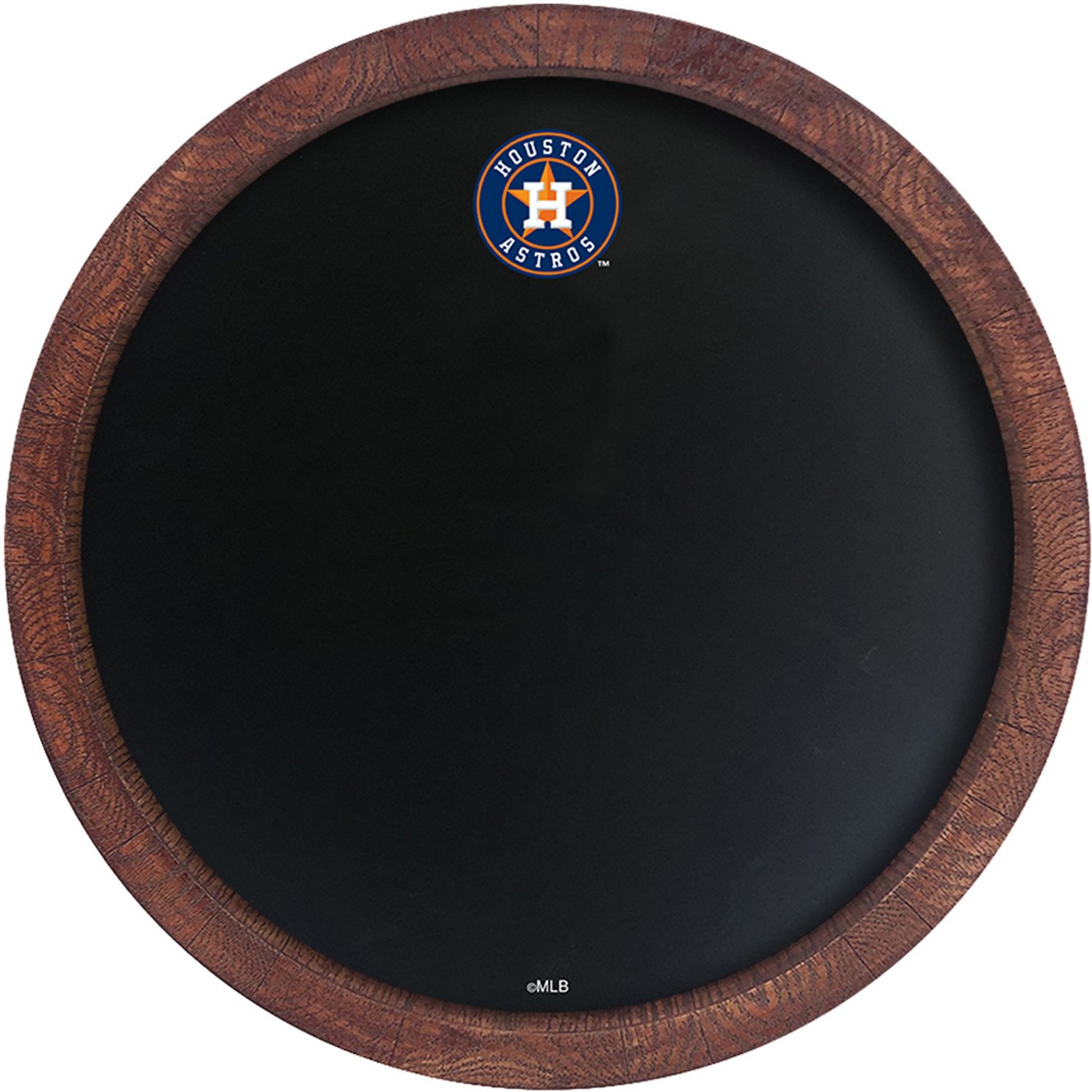 Keep track of important stats or write inspiring messages on The Fan-Brand Houston Astros Logo Chalkboard Faux Barrel Top Sign. The sign is made of injection-molded plastic with a hand-stained frame to give it an authentic wood appearance, and its silk-screen chalkboard surface and team design make it a great addition to your Astros fan cave.