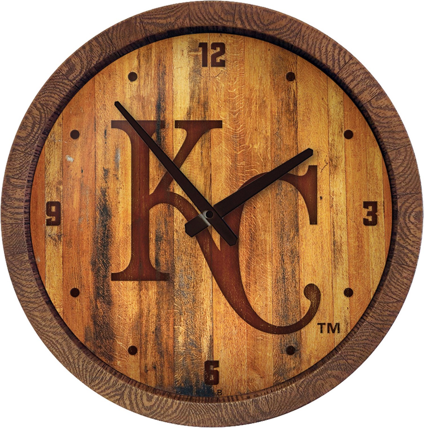 Be sure not to miss the first pitch when you make The Fan-Brand Kansas City Royals Branded Faux Barrel Top Wall Clock part of your fan cave. The high-resolution digital print with UV-stable ink makes it clear you root for the Royals, and the hand-stained design provides the look of real wood.