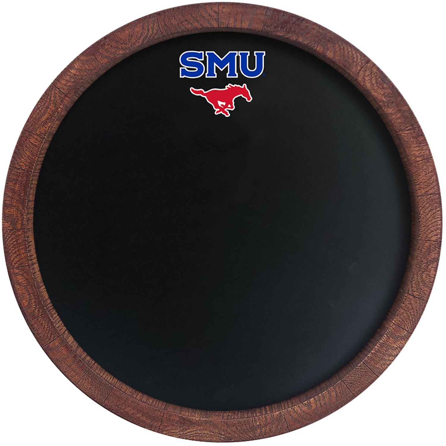 Keep score on The Fan-Brand Southern Methodist University Logo Barrel Top Chalkboard. The injection-molded plastic construction affords durability, while the Hand stained wood offers an authentic look. The silk-screen chalkboard surface allows for smooth writing, and the team logo shows off your love for the Mustangs.