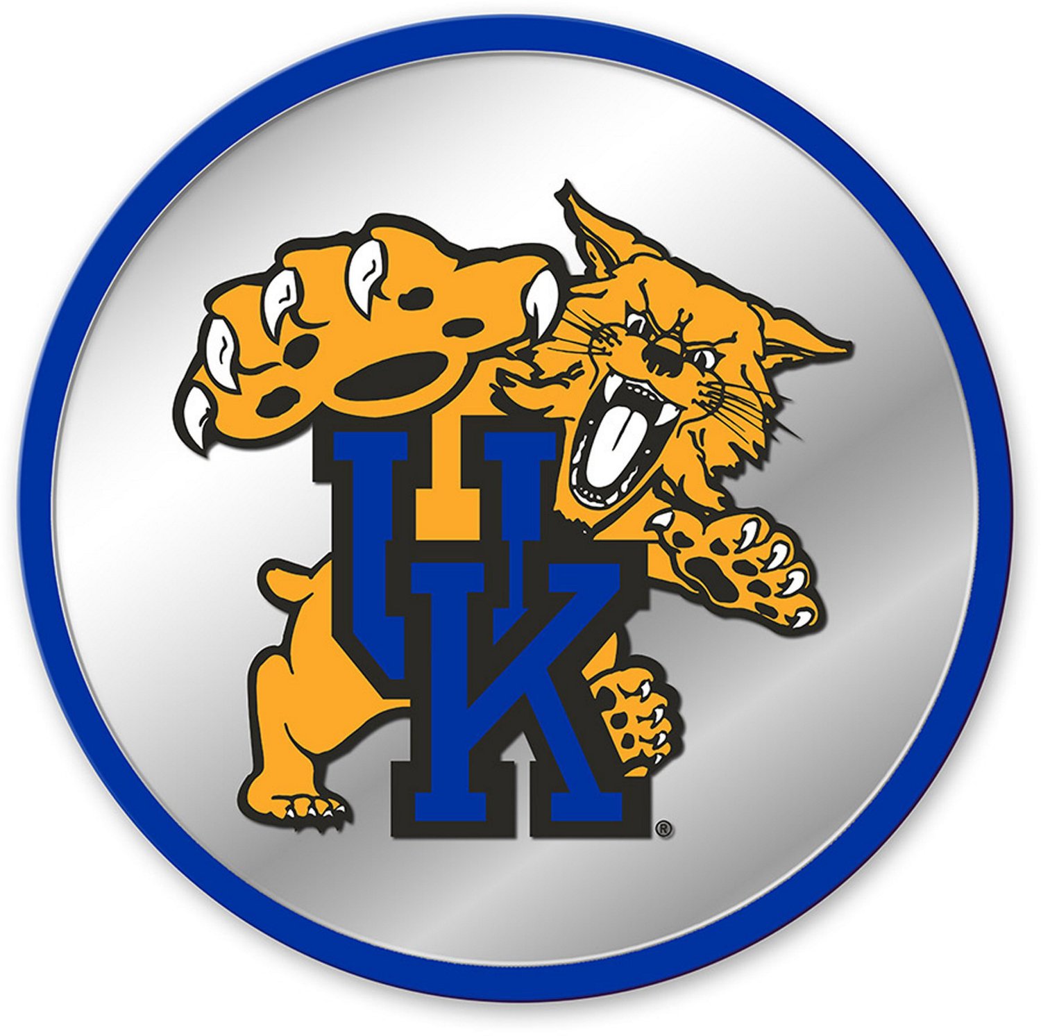 Showcase your Wildcats team spirit with The Fan-Brand University of Kentucky Mascot Modern Disc Mirrored Wall Sign. This round sign is made of heavy-duty, injection-molded plastic and has a mirrored acrylic surface with a high-impact styrene frame for long-lasting durability. The Kentucky mascot is digitally printed in high resolution with UV-stable ink to show your team pride.