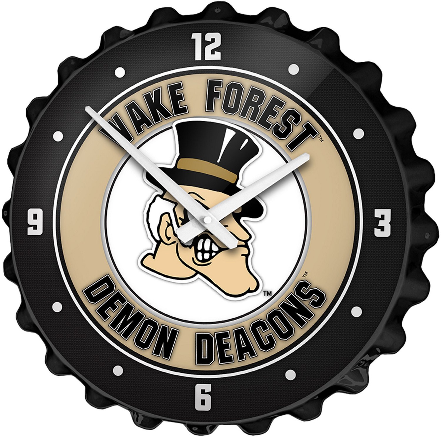 Crown any room with Demon Deacons style with The Fan-Brand Wake Forest University Mascot Bottle Cap Clock. The stylish face displays a digitally printed finish, and the team design showcases your fan pride. Made in the USA.