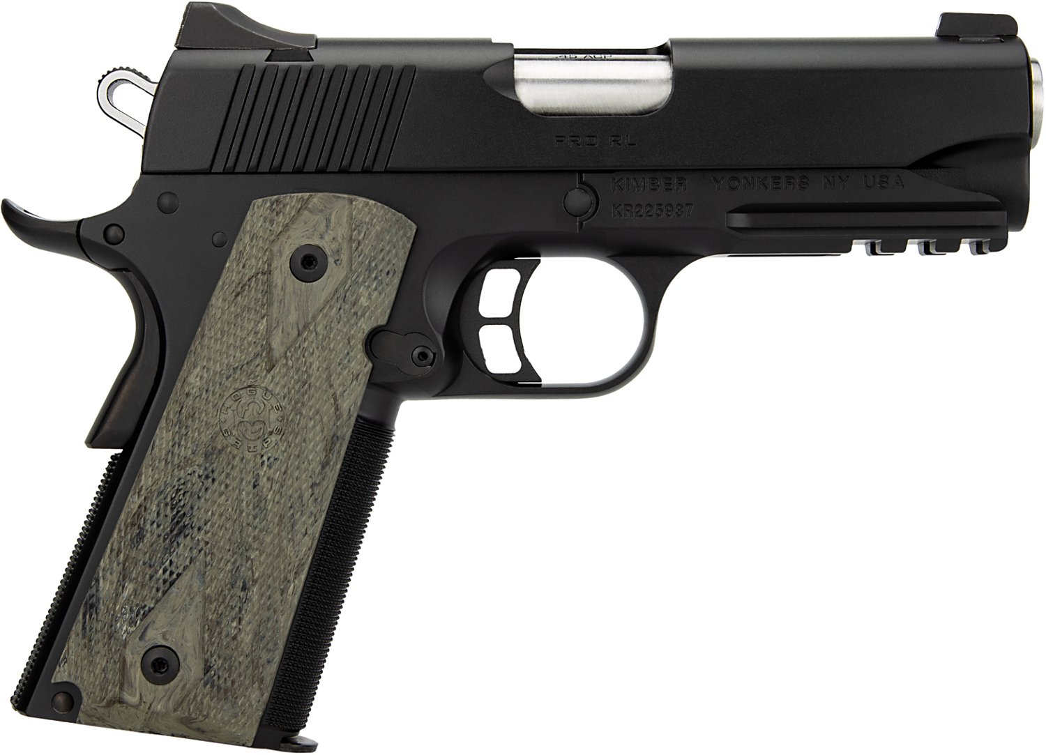 The Kimber Pro RL Commander .45 ACP Pistol is a single-action pistol featuring an 8-round capacity and a stainless-steel barrel. A 2-hole trigger, along with front and rear night sights, round out the design.