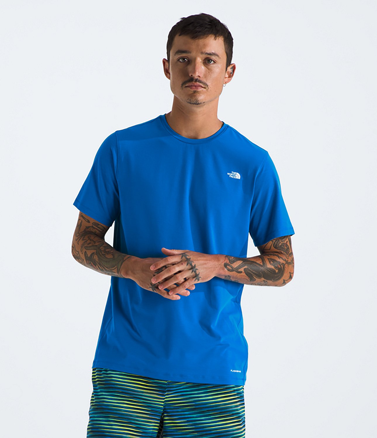 Look your best in The North Face Men's Adventure T-shirt. It is made of 92% recycled polyester and 8% elastane. The FlashDry-XDâ„¢ materials offer enhanced moisture management to help keep you comfortable, and its increased snag resistance provides extra durability. The short, set-in sleeves allow for a tailored look.