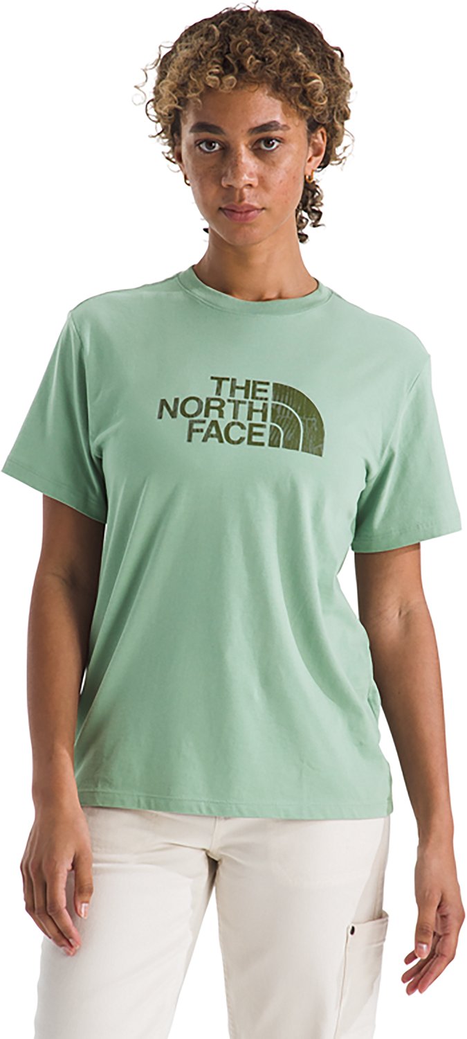 Journey forth with The North Face Women's Evolution Regenerative Ink Half Dome Graphic T-shirt. The cotton material provides a comfortable feel, while the heat-transferred graphics offer a stylish look.