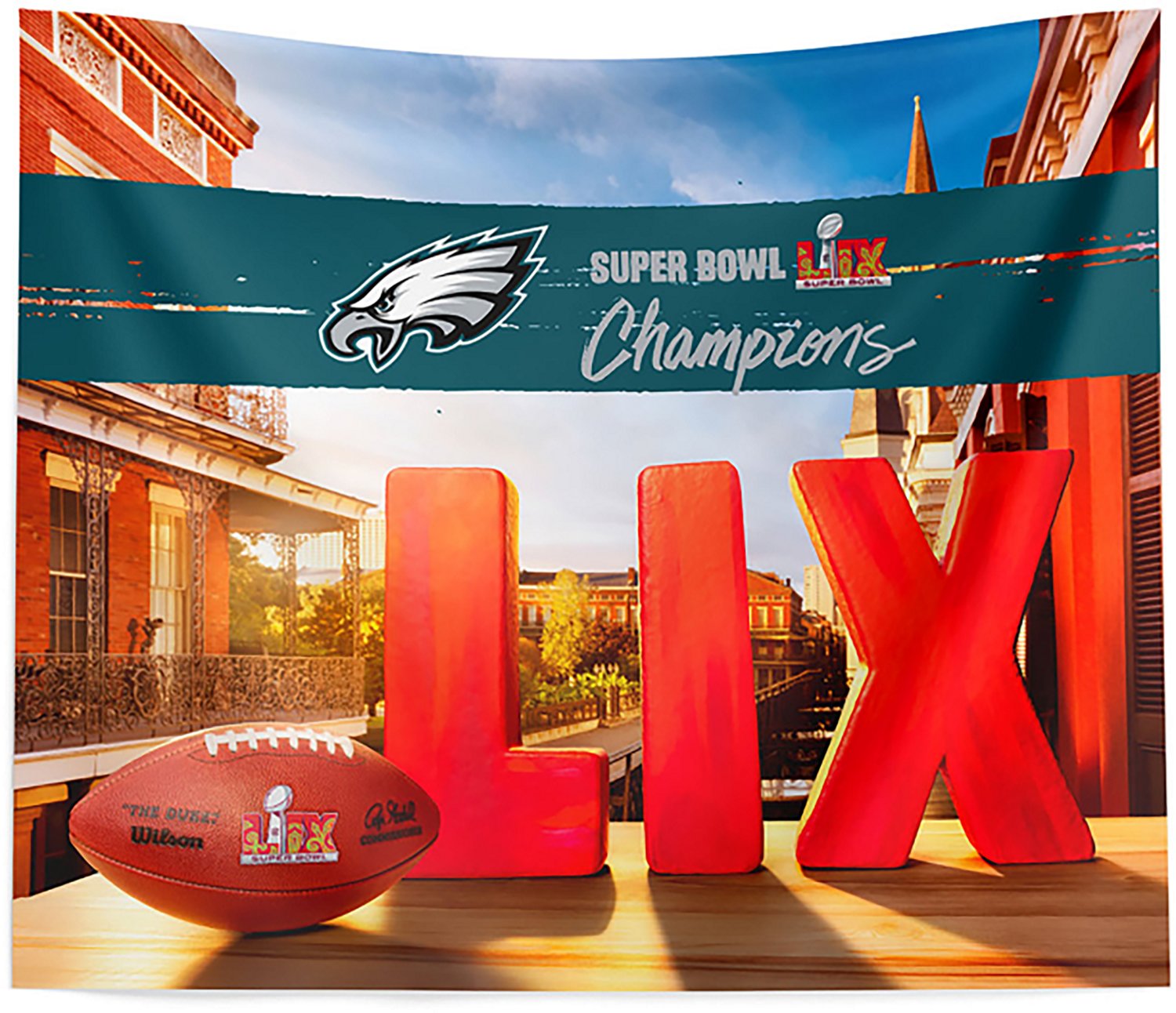 Celebrate the Philadelphia Eagles' Super Bowl LIX victory with this commemorative wall hanging! Show your team pride with this impressive 34" x 40" piece, perfect for displaying in your home, office, or fan cave. Featuring striking graphics commemorating the Eagles' championship win, this wall hanging is a must-have for any die-hard Eagles fan and a great way to commemorate a historic moment.