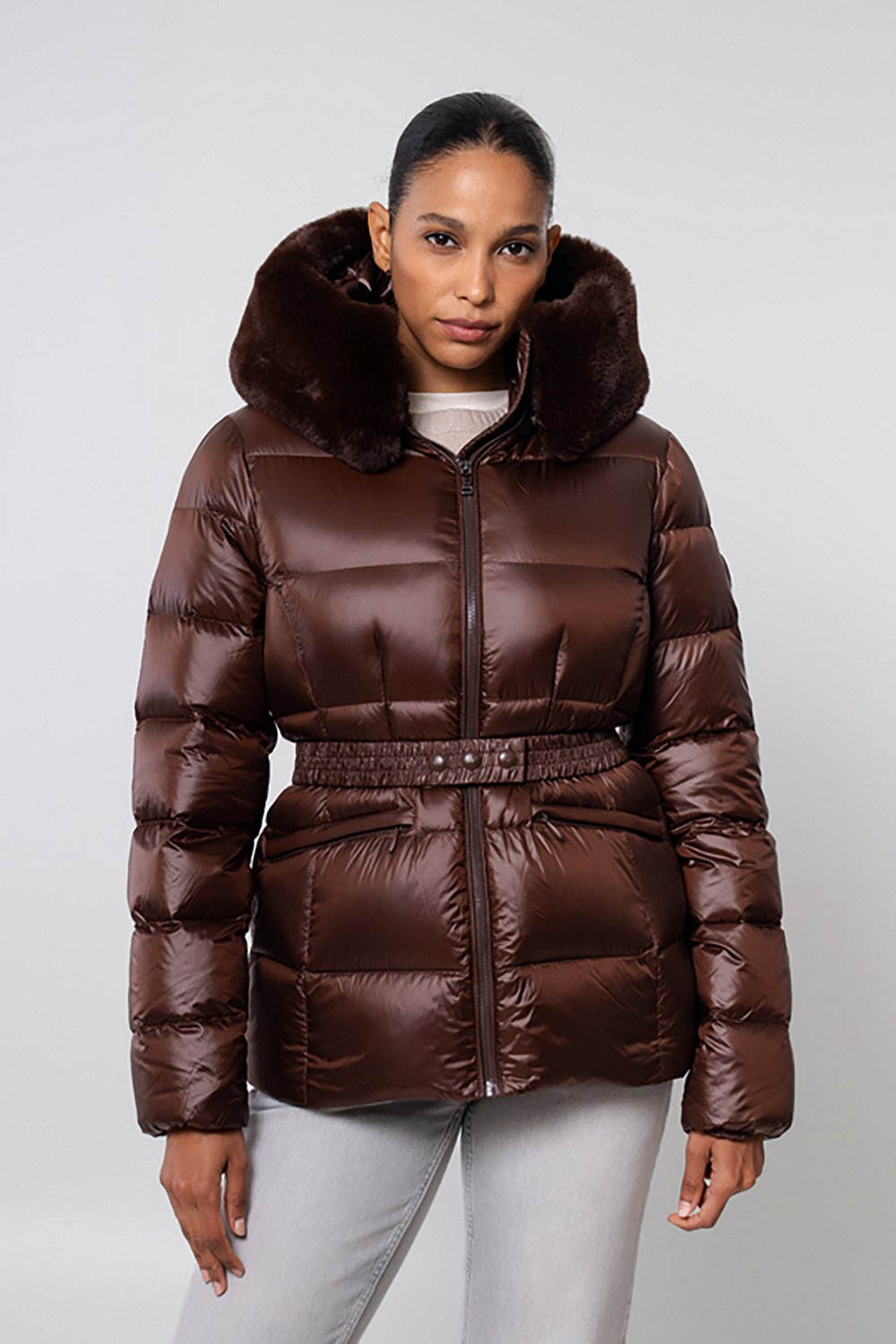 Stay bundled wearing The Recycled Planet Women's Lux Jacket. This jacket features a recycled shiny nylon shell for durability and recycled down and feather insulation for warmth. The adjustable elastic belt with snaps and suppressed waist provide a secure fit.