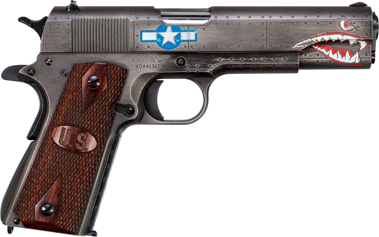The Thompson 1911 Squadron Special Edition WW2 .45 ACP Pistol is a decorated replica firearm with graphics inspired by WW2 aircraft. The slide is serrated and engraved, and the checkered wood grips feature integrated U.S. logos. It also comes with a thumb safety.