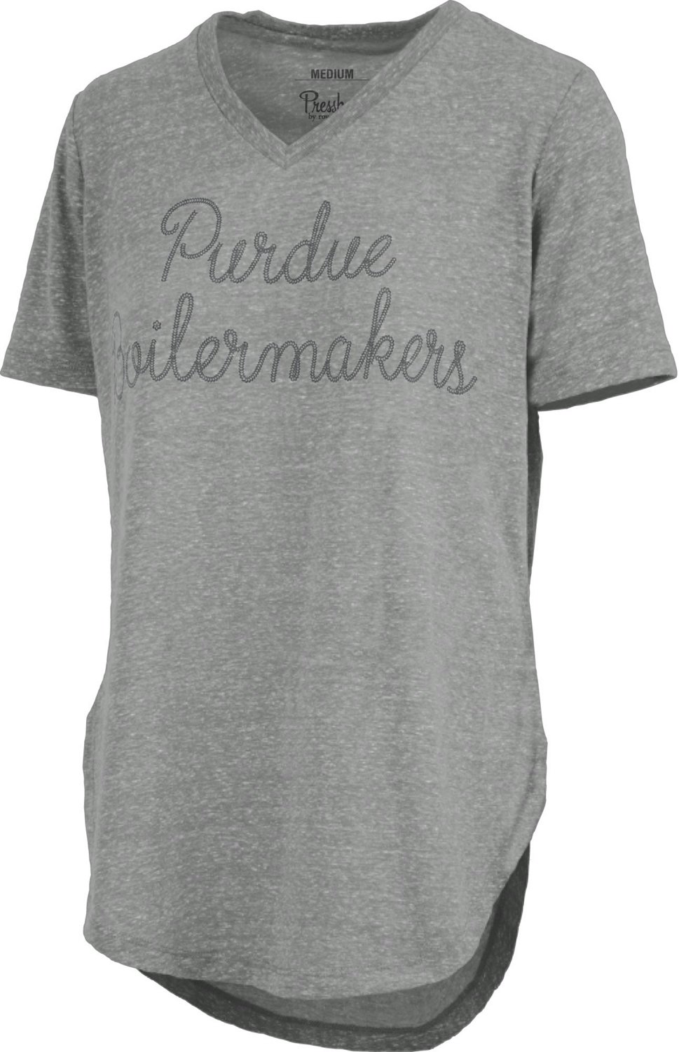 Watch the Boilermakers game sporting the Three Square Women's Purdue University Knobi Stardust Chain Puff V-neck T-shirt. The polyester/cotton/viscose construction provides a comfortable fit, and the puff ink, chain stitch team design highlight your fandom. A rounded bottom adds a stylish touch.