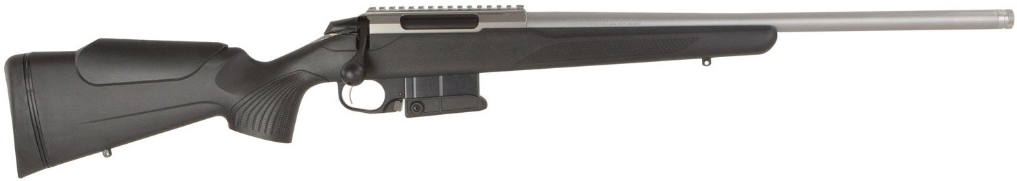 The Tikka T3x Compact .308 Winchester/7.62 NATO Bolt-Action Rifle features stainless-steel construction with an integrated scope rail. The barrel is 20 inches long with threading. Adjustable, single-stage trigger. 2-stage safety.