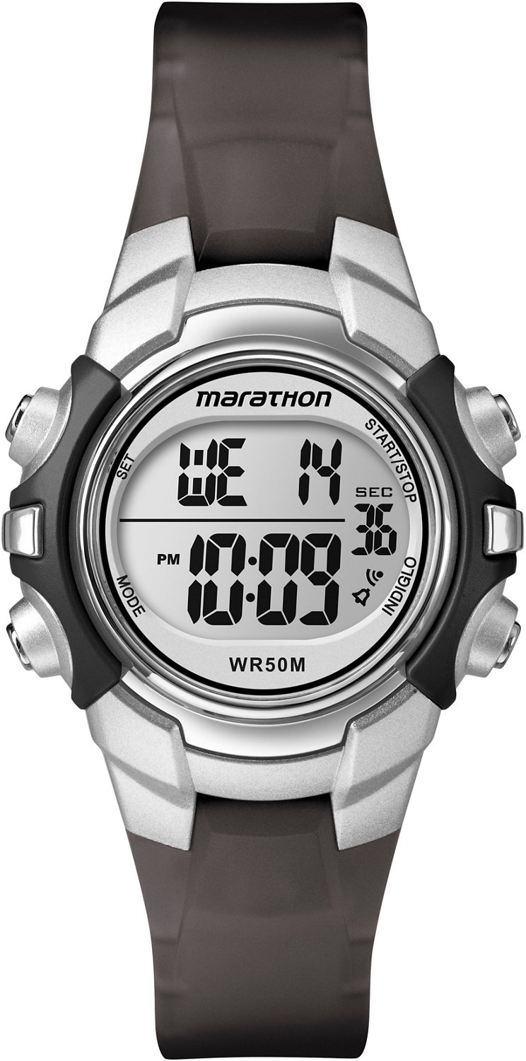 Get the most out of your workout with the Timex Women's Marathon Watch, which features a 24-hour chronograph, 2 time zone settings and a daily alarm for everyday use. The INDIGLO® night-light provides illumination for clear reading in low-light conditions, and the polyurethane case and acrylic crystal provide durability.