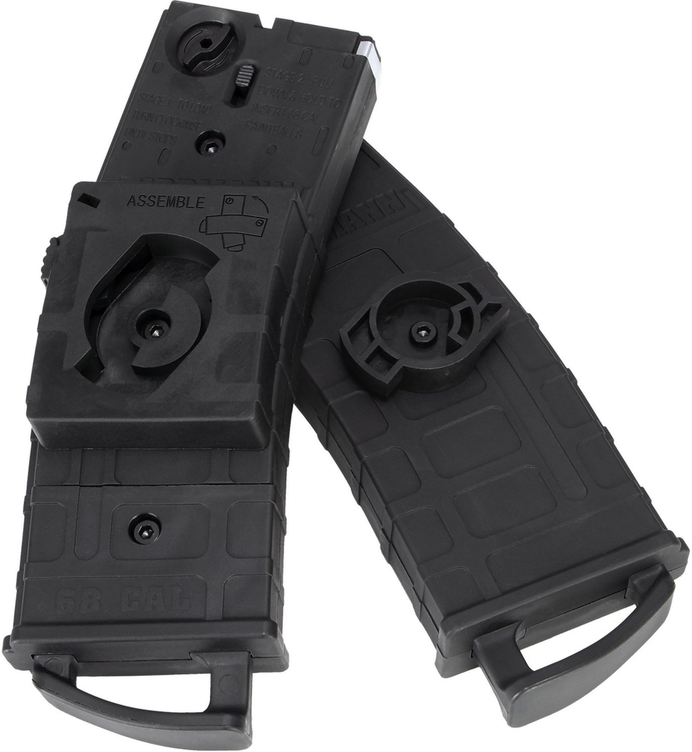 Includes two .68 caliber paintball magazines that hold up to 20 rounds