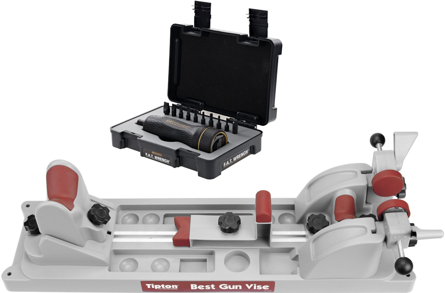 Clean and maintain your gun collection with the Tipton Best Gun Vise Bundle. Suitable for working on bolt action rifles, break open shotguns, AR-15s and handguns, this bundle has everything you need to keep your collection in working condition. The Wheeler F.A.T Wrench provides repeatable, accurate torque, while solvent-resistant polymer ensures longevity. A rubberized handle provides ergonomic comfort, and the phosphate coating helps prevent rust and corrosion.