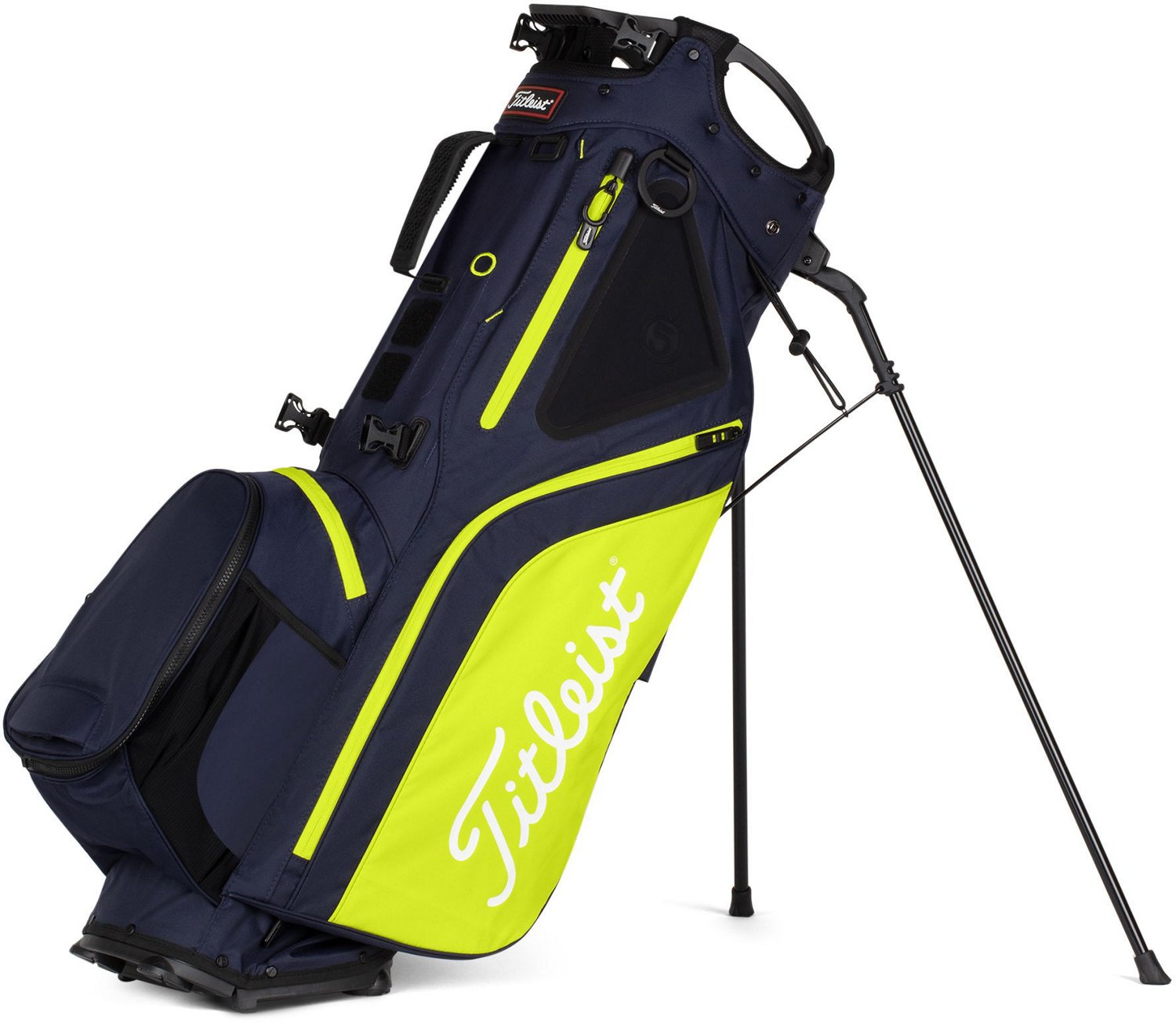 Stay ready for the green with help from the Titleist 2021 Hybrid 5 Golf Stand Bag. The push cart and trolley-friendly design with an integrated cart strap tunnel offers convenient transport and the premium double strap helps ensure comfortable carrying. The 7-pocket construction with a waterproof valuables pocket provides secure storage for your essentials, while the external water bottle pockets keep your beverages accessible for easy hydration on the go.