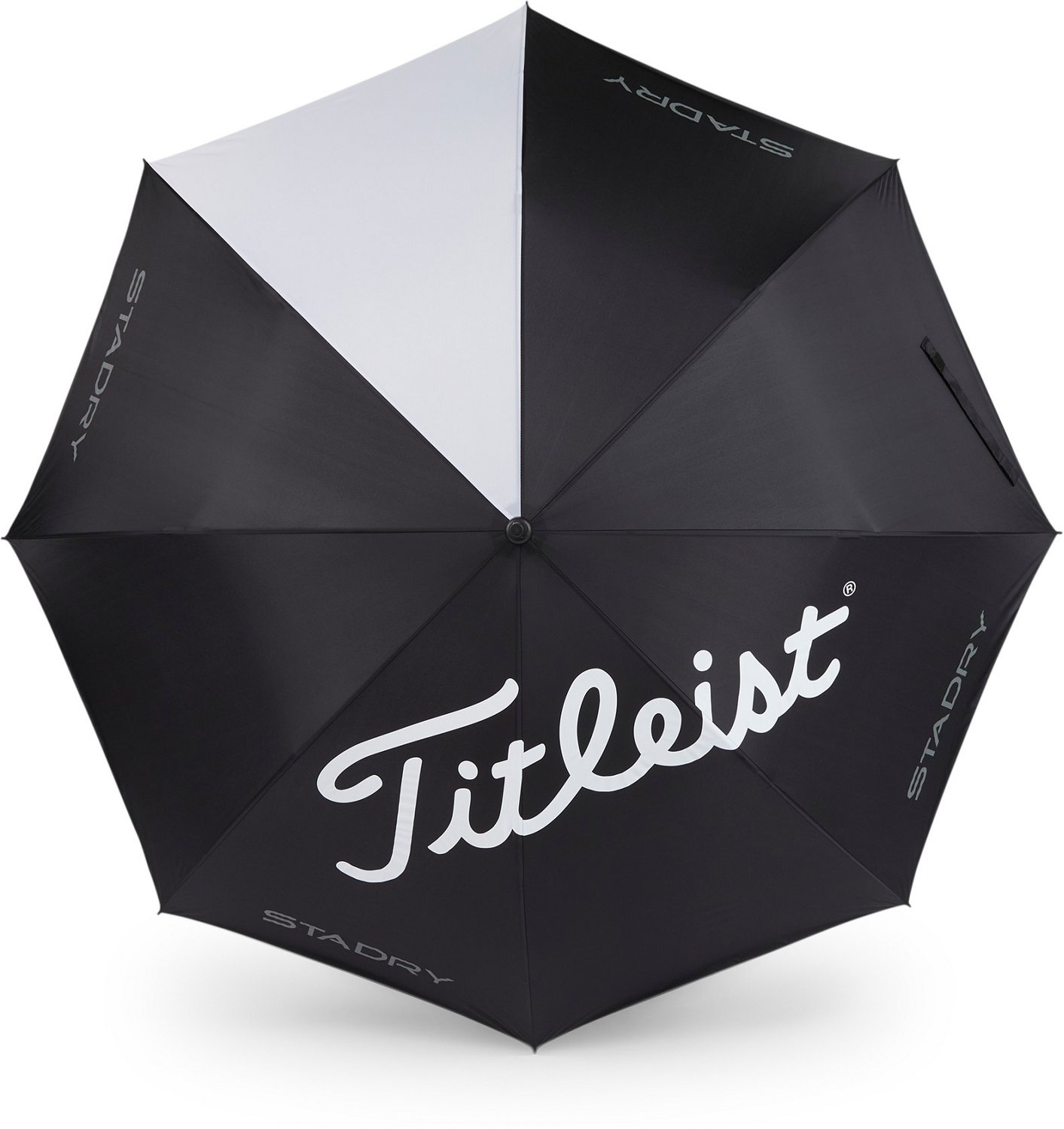 Shield yourself from inclement weather on the golf course with the Titleist StaDry Single Canopy Golf Umbrella. The reinforced struts and ribs offer durability, while the soft foam handle with debossed Titleist script gives you a comfortable hold.