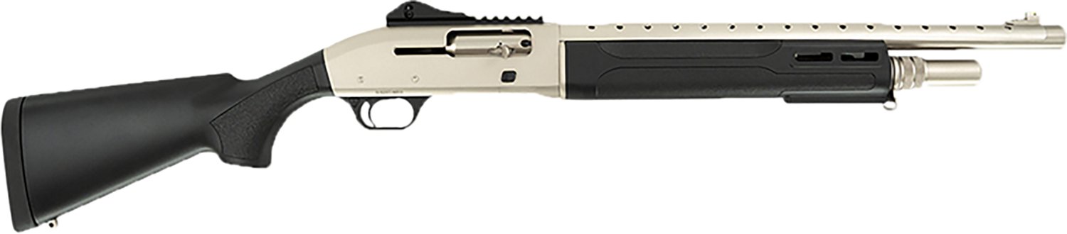 18.5-inch barrels with a 12-gauge bore, heat shield and an anodized nickel finish