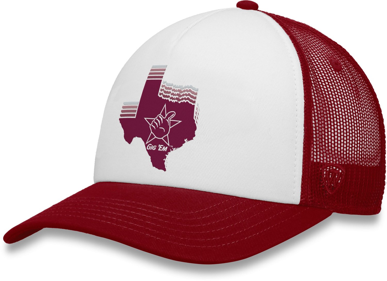 Show your Aggies pride when you sport the Top of the World Men's Texas A&M University Roots Retro 2-Tone Snapback Cap. This cap features a polyester and cotton construction for comfort and durability. The team design highlights your fandom with a retro look, and the snapback closure lets you tighten and loosen the fit with ease.