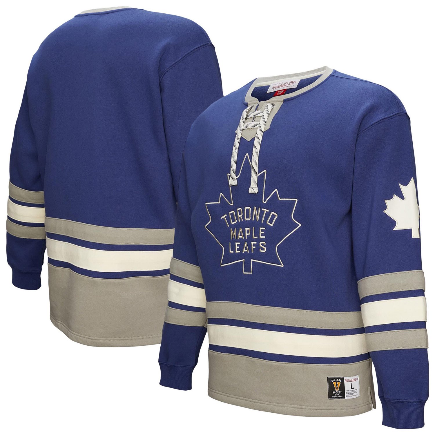 Channel your love for the Toronto Maple Leafs with throwback flair by grabbing with this Heritage Lace-Up Pullover Sweatshirt This pullover sweatshirt boasts a vintage team graphic printed across the torso showcasing classic Toronto Maple Leafs style The lace-up neck and sewn-on contrast-color stripes add unique design elements that elevate your cool-weather look while the fleece lining gives this comfy sweatshirt added warmth