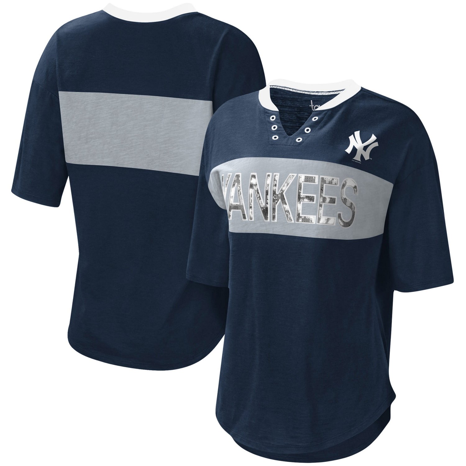 The Women's Touch Navy/Gray New York Yankees Lead Off Notch Neck T-shirt is a stylish and comfortable way to show your support for the New York Yankees Made from a soft cotton and polyester blend this t-shirt features a rounded droptail hem and eye-catching sequin details The New York Yankees logo is proudly displayed on the front making it the perfect way to show your team spirit Whether you're cheering on the Yankees at the stadium or just relaxing at home this t-shirt is sure to become a favorite