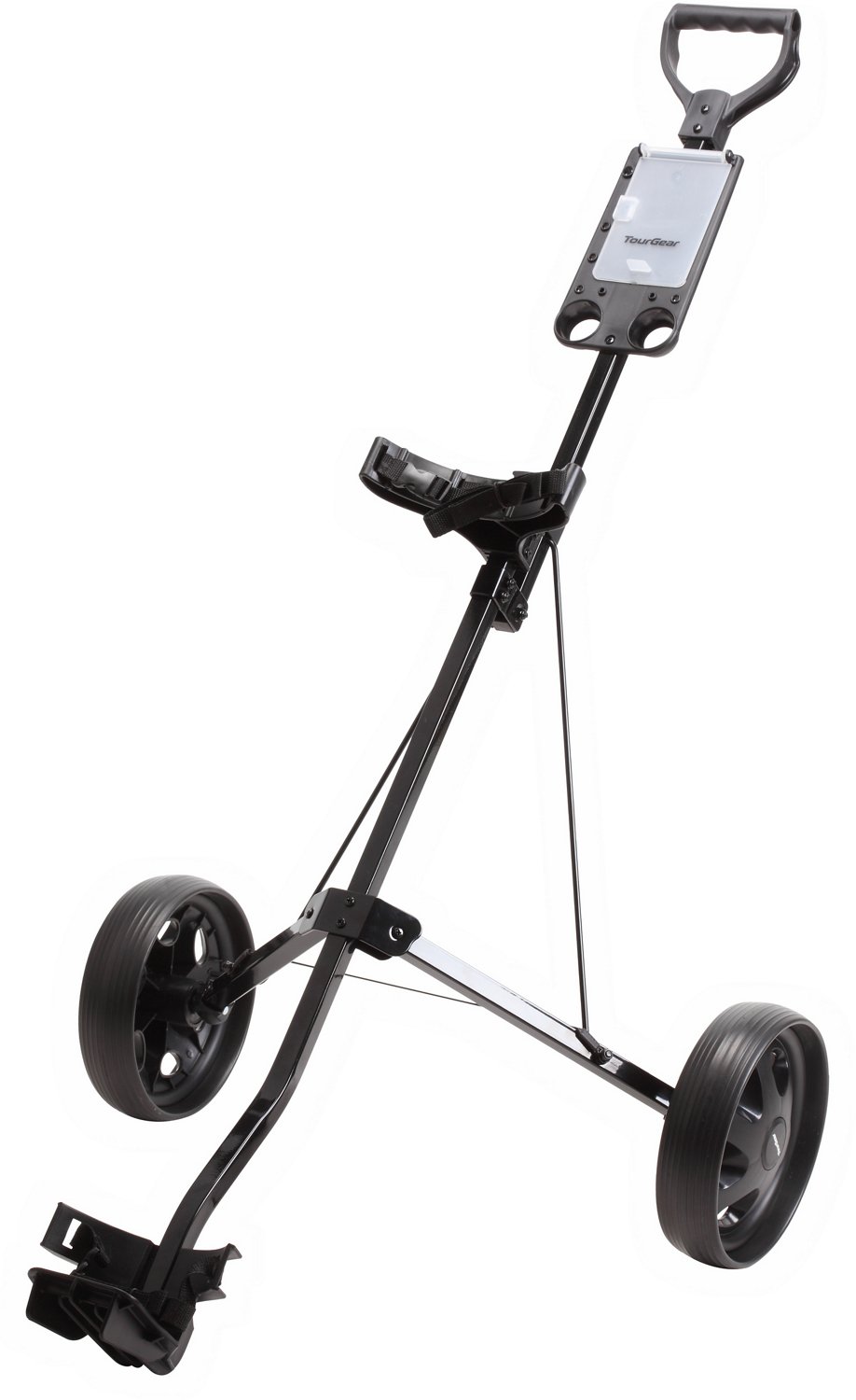 Complete with quick-release wheels and a folding design, the Tour Gear TG-2 Lightweight 2-Wheel Pull Golf Cart makes it easy to tow your gear along the golf course and pack up when you're done. The molded, oversize grip provides comfort, and the straps are adjustable for a secure fit around your bag.