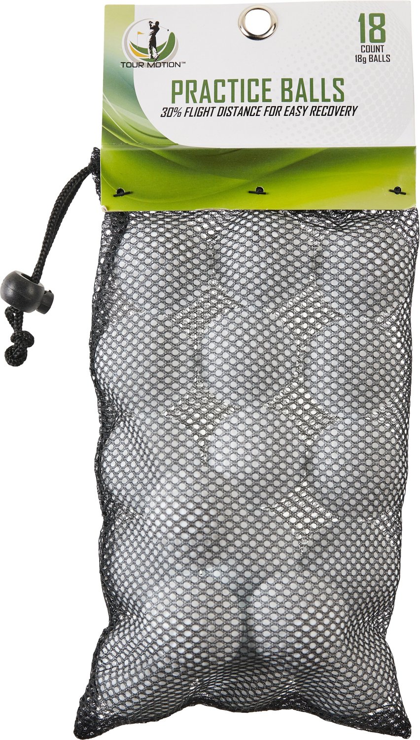 Practice your swing with the Tour Motion 18 g Practice Golf Balls 18-Pack. Each ball has a 30% flight distance for simple retrieval, and the included mesh storage bag provides easy transport.