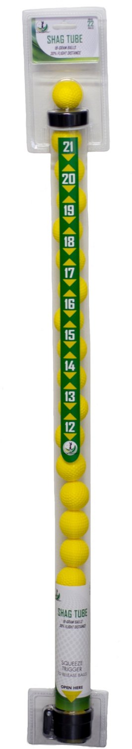 Work on your golf game with the Tour Motion 18-gram Practice Balls with Tube. This shag golf tube comes with 18-gram balls and holds up to 22 golf balls. Simply squeeze the trigger to release the balls.