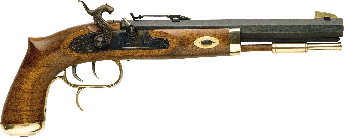 Equipped with a primitive-style, adjustable rear sight and blade front sight, the Traditions Trapper .50 Black Powder Pistol features a 9.75-inch octagonal barrel with a blued finish and a hardwood stock. The double-set triggers can be fired either set or unset.
