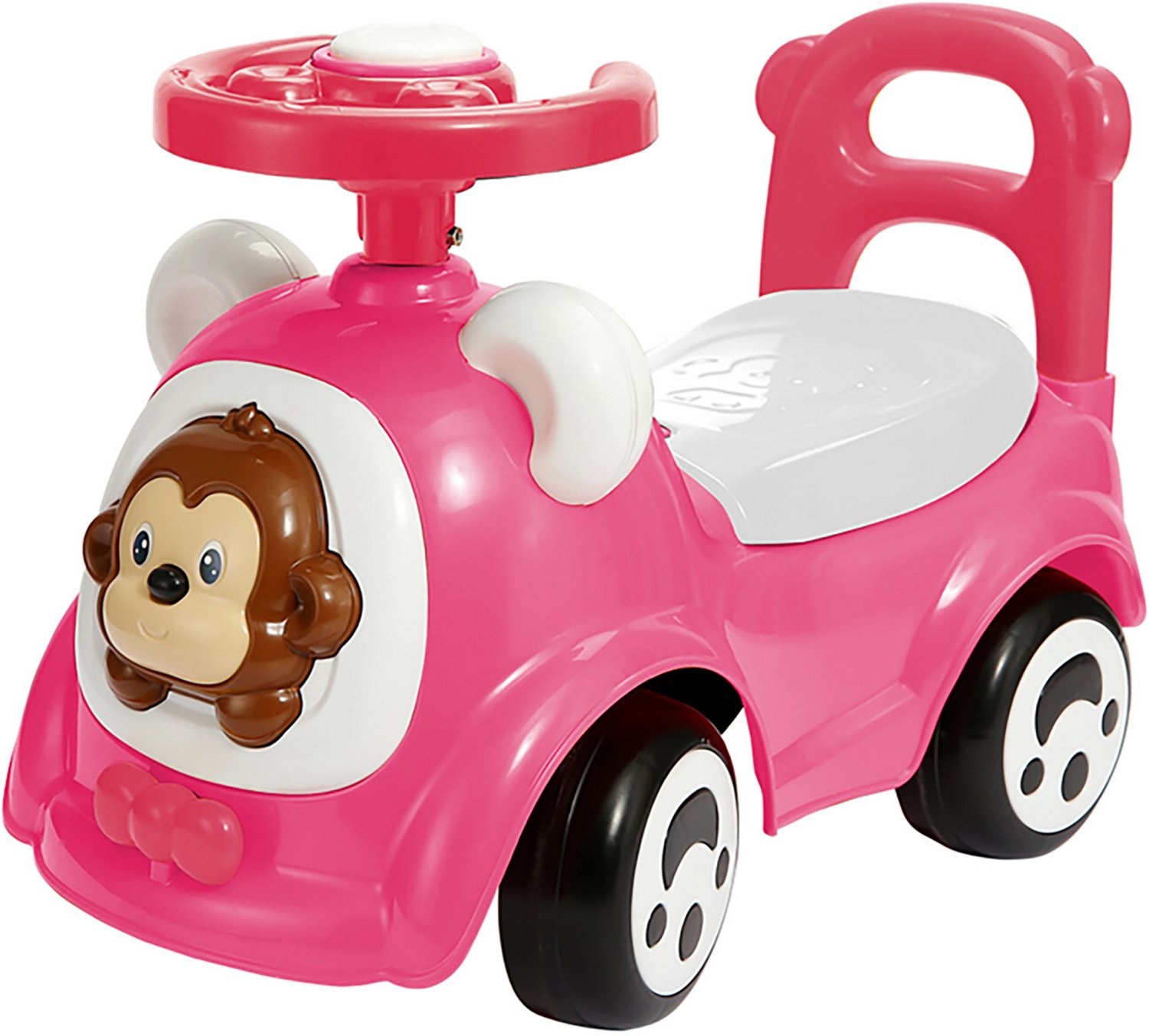 Go for a ride with the Trimate Monkey Push & Ride Racer Ride On Car. The plastic frame affords durability, while the large backrest and seat provide comfort.