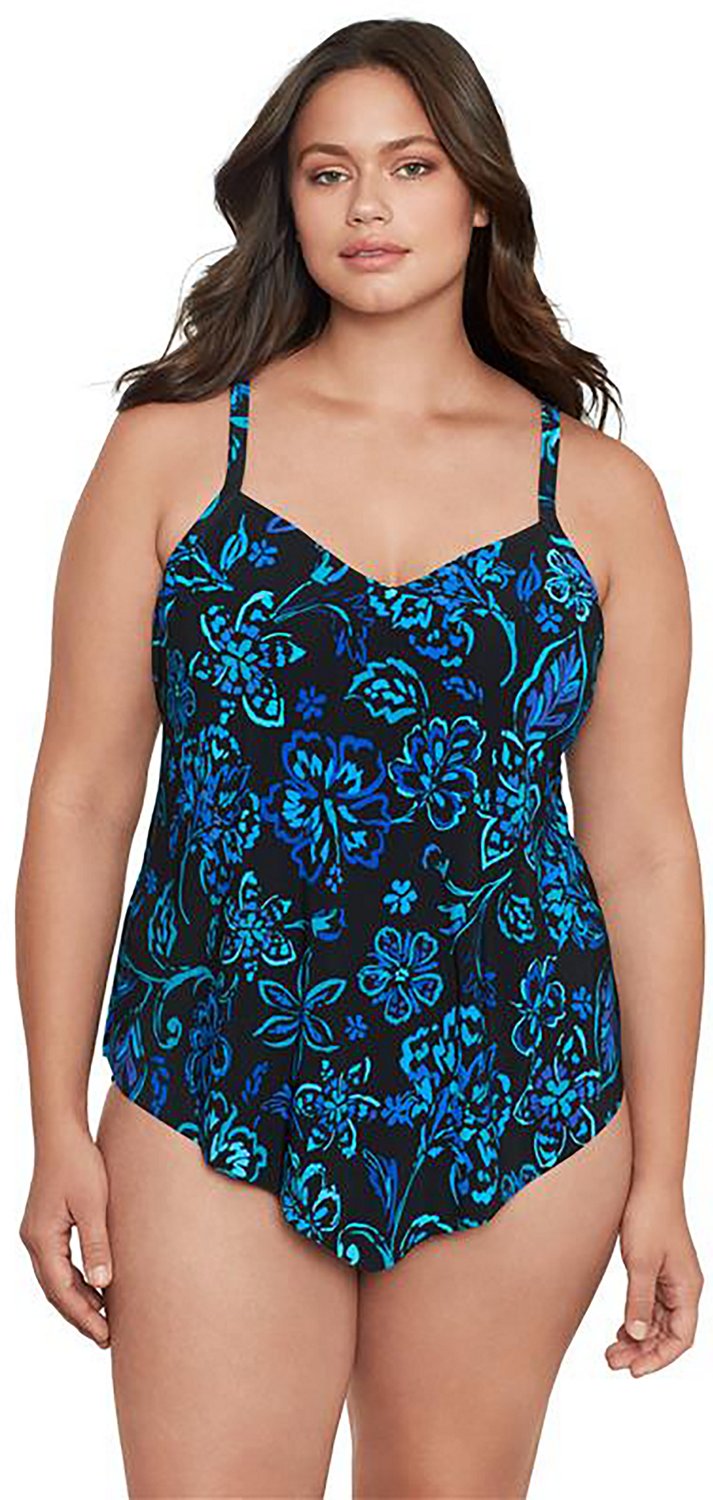 Make a splash or enjoy the sun with the Trimshaper Women's Hank Plus Batik Blooms Tankini. The tankini silhouette is easy-wearing and fashionable, and the polyester and spandex blend material is durable and stretchy.