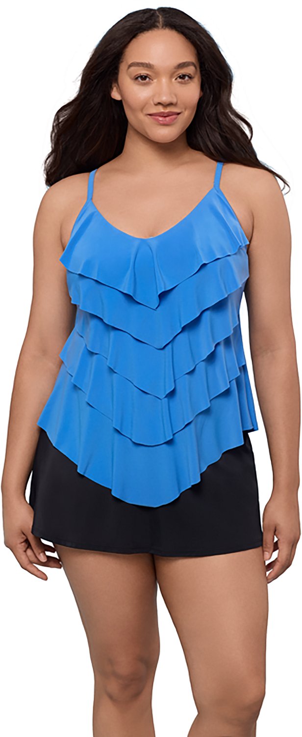 Stay comfortable while you swim wearing this Trimshaper Women's Solid Rachel Tankini in the water. Its 95% polyester, 5% Spandex fabric provides a pleasant feel all day long.
