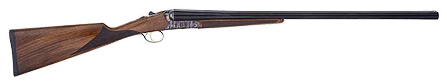 The TriStar Sporting Arms Bristol 12 Gauge Side By Side Shotgun is break action and has a 2-round capacity. It's built with a steel receiver, Turkish walnut wood stock and a fiber optic front sight.