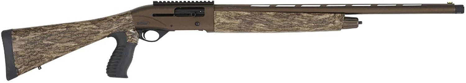 The Tristar Sporting Arms Viper G2 Turkey 28 Gauge Semi-Auto Shotgun has a 24-inch barrel and a 2.75-inch chamber with a 5 + 1 capacity. Weighing 6.3 pounds, this firearm also features fixed sights with a fiber optic sight in front, three chokes with a choke box and choke wrench and a rubber recoil pad. The shotgun has an applied cerakote finish, a Mossy Oak Bottomlands® camo stock and a pistol grip.
