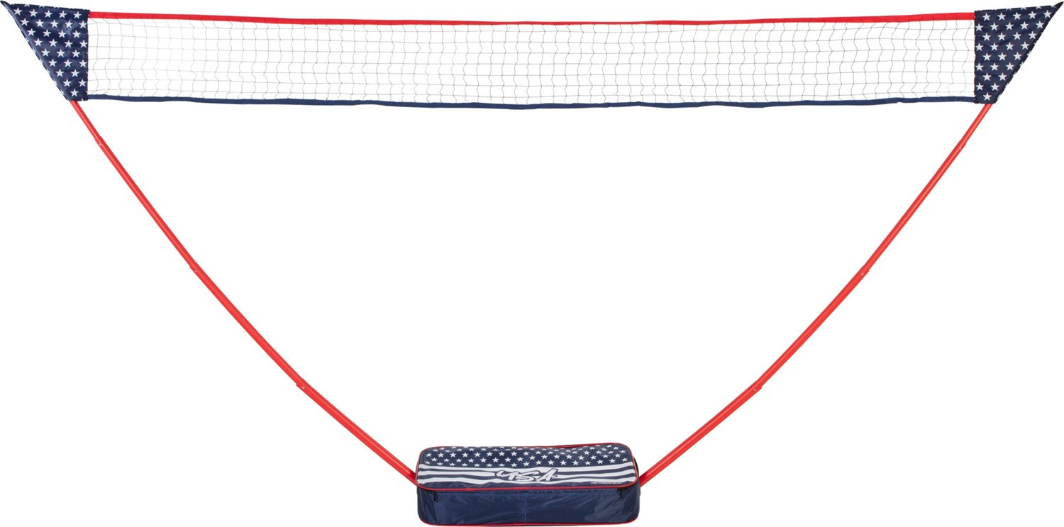 Take the Triumph Patriotic Portable Badminton Set with you anywhere and fun is sure to follow. This two to four player set is perfect for active families and is a great addition to any cook out, beach party or tailgate. No tools or stakes are required to assemble this badminton set. To assemble, simply extend the telescopic poles, attach the net and you’re ready to play. The freestanding base sets up on any surface and doubles as a lightweight carrying case. Don’t worry about buying additional accessories, this set includes four rackets (two red, two green), two shuttlecocks, net, and carrying case.