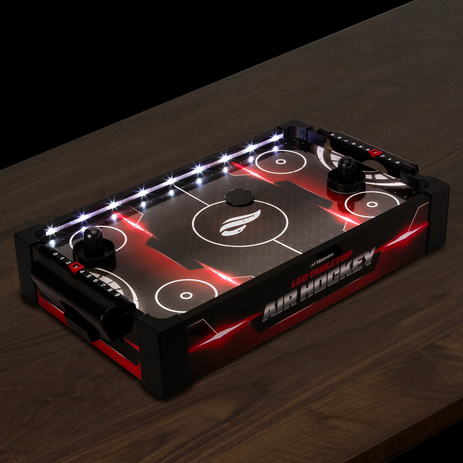 Elevate your game night with the Triumph Sports Adventures LED Tabletop Air Hockey. Featuring illuminated sides that bring a thrilling light-up twist to this classic game. Equipped with a strong motor, this table ensures even and consistent airflow for fast-paced and smooth gameplay. Keep track of the action with built-in manual scorekeepers, allowing you to stay focused on the excitement. This compact table is perfect for both play and storage in any space.