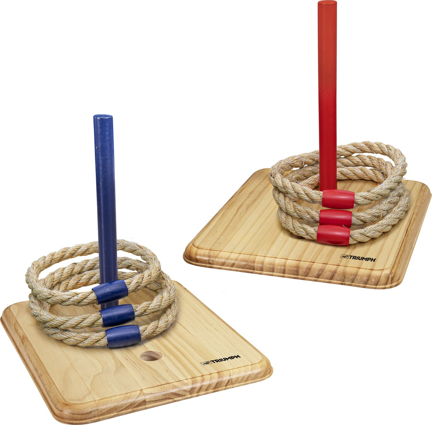 The Triumph Wood Quoit Set is a safe, fun toss game that plays like horseshoes with sisal rope rings. Matches are played player against player or in teams of two players each. The tournament quoit pitching distance is 21 feet between pins but this quoit set can be played at any fun pitching distance. Points are scored by tossing ringers (3 points) or landing rings on the wood target platform (1 point). The targets are designed to stack with the six rope quoits (3 red and 3 blue) wrapped around the two pins for convenient storage. The stackable solid wood targets feature 9" pins.